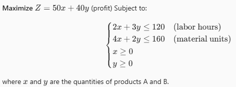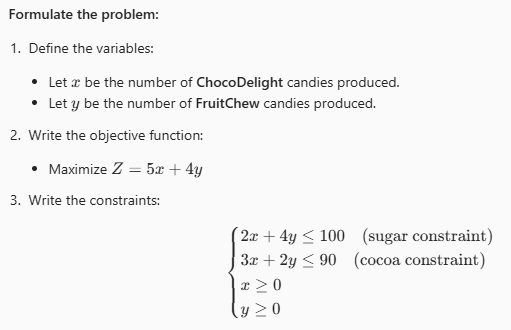 - Scenario: You own a candy factory that produces two types of candies: ChocoDelight and FruitChew. Each type of candy requires a certain amount of sugar and cocoa. You have a limited supply of both sugar and cocoa, and you want to maximize your profit.